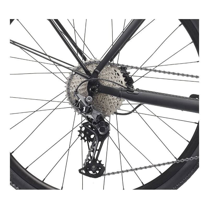 Il dispose d’une transmission Shimano Deore en mono plateau 11 vitesses. Son cadre en aluminium à disque le rend légers et confortable.