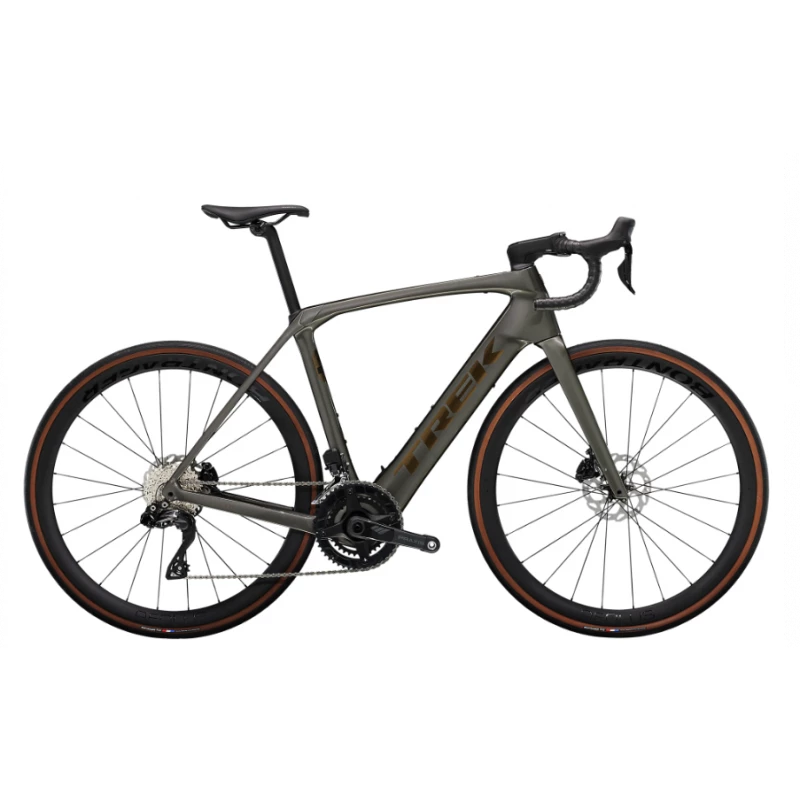 Notre cadre en carbone OCLV Série 800, le plus haut de gamme et le plus léger, avec technologie IsoSpeed à l’arrière. Un puissant moteur TQ à démultiplicateur harmonique à anneau à broches, de 50 Nm assistant le pédalage jusqu’à 25 km/h, une batterie intégrée de 360 Wh, un écran LED intelligent intégré, et des commandes de mode d’assistance discrètement intégrées aux cocottes. Des roues Aeolus Pro 37 en carbone OCLV, une transmission électronique sans fil Shimano 105 2×12 Di2, des manivelles de pédalier en carbone, un cintre Bontrager Pro Iso-Core anti-vibrations et une potence RCS Pro à acheminement interne des câbles, pour un style épuré.