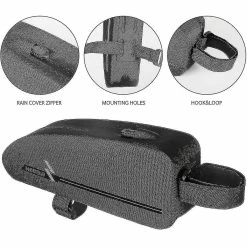Product DescriptionMaterial: Nylon+Waterproof film+PP sheetSize: small, 21.5 * 5.5 * 8.5 cm; large, 23.5 * 6.5 * 10.5 cmCapacity: small, 1L; large, 2LColour: BlackQuantity: 1 piecePackage content: 1 piece * beam package1.Easy to InstallEquipped with adjustable hook and loop, install and release quickly without any tools. This bike frame bag does not move and shift around like some other bike bag, even stayed in place on rowdy descents and no issues with rubbing on legs.2.Large CapacityPerfect size for the mountain bike with plenty of room for your cell phone, wallet, keys, gloves, small tools, energy bar, gels, nutrition or extra junk. Its big enough to carry everything your need3.Waterproof \u0026 DurableMade of nylon and and TPU material, durable, sturdy, waterproof. Easy to clean and care. The bike handlebar bag can protect your items from rain and dirt, you can have a cool riding.Inside the bag there are keel made of PP so that the bike bag is not easily deformed.4.A Long Slim Body Top tube bike bag has a proper design make you ride more smoothly and comfortable, your knees will never hit the frame bike bag. 5.Humanization Design The front bike bag is portable, you can take this bike pouch easily while leaving away from your bike. Reflective trim of bags to keep your night ride safety.