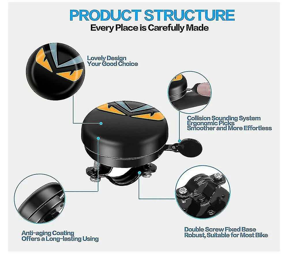 &ANTI-RUST COATING & OUTSTANDING CRAFT:Bike bell is made of alloy steel material with anti-rust and anti-aging coating, which offers a long-lasting using.&SAFETY FEATURE and STURDY BASE:1.The rounded arc pick is smooth, just push it gently and you’ll hear the crisp ringtone.A bell on one’s bike to be an important safety feature when riding on the roads.It is labor-saving and time-saving to press the bell while riding. 2.The mini bike bells has a thicken copper alloy base which will not easily break out. It is sturdy enough to securely hold the bell as well as the handlebar.&HARD COPPER HAMMER & MELODIOUS LOUD SOUND:This bike horn ring features a rotated collision sounding system, the volume can reach to110 db, it is loud enough to alert the passerby and cars.&EASY TO INSTALL: Fits for bicycles handlebar tube outer diameter with 21mm – 23mm (0.83inch – 0.90inch).1 MINUTE to complete installation. Just tighten the screw on the handle bar with a screwdriver.&WIDE APPLICATION: Loud sound bike ring can be apply on road bike, mountain bike, city bike, sports bike, cruiser bike, BMX bike, etc. This is a perfect choice if you looking for a cute cartoon bike bell.