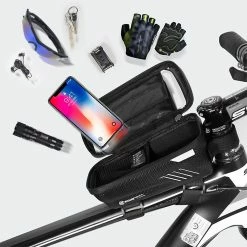 Big Space & Reflective TapThe bike front frame bag has enough inside room for long rides, holds a lot of stuff i.e phone, battery, glasses, gloves, earphone, mini-flashlight, energy gel, small tire pump, repair kits, keys, wallet etc.Reflective tape on both sides of our bike bag keeps your night ride safety effectively.