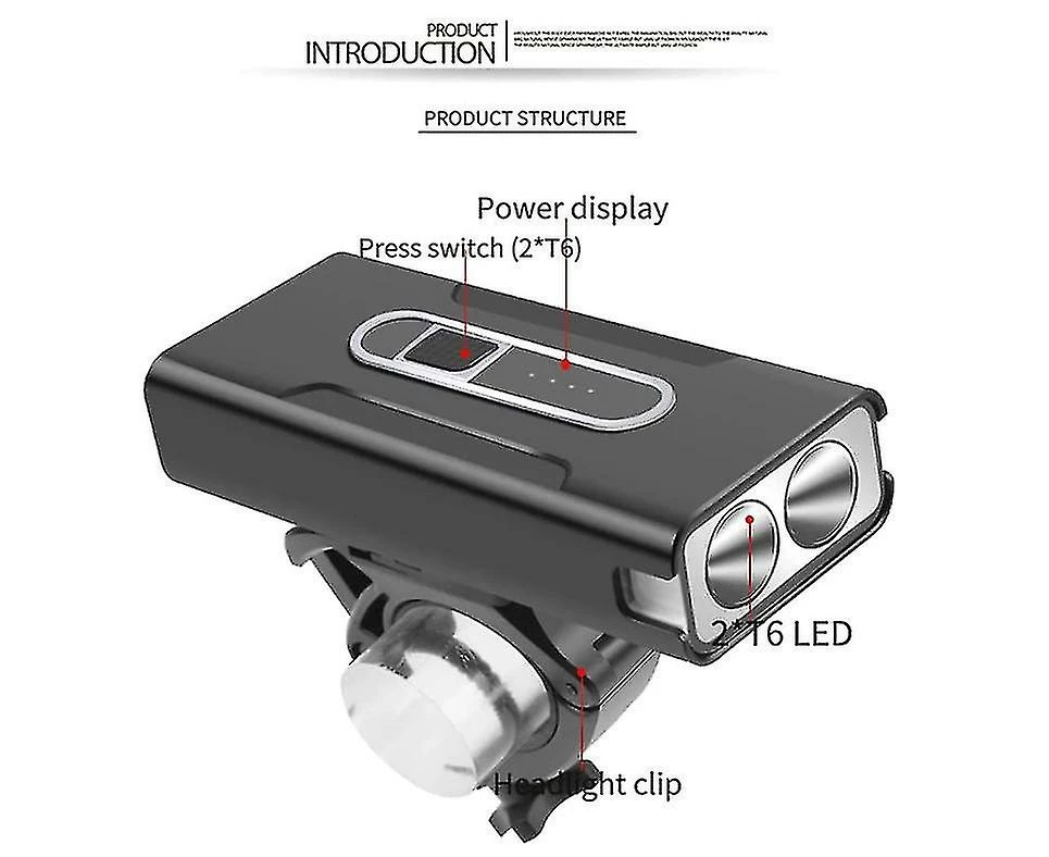 Quatre voyants d’alimentation, feux latéraux et voyants d’avertissement rougeBulbe: 2 * T6 + feu latéral LED lumière rougeTaille du produit: 10 * 4.6 * 2.3cm. Matériel: alliage d’aluminium. Commutateur: interrupteur poussoirMode de charge: la charge micro USB prend en charge la sortie d’alimentation et peut être utilisée comme alimentation de secours du téléphone mobileBatterie: Protection de charge / décharge de la batterie au lithium intégrée de 2400 mA